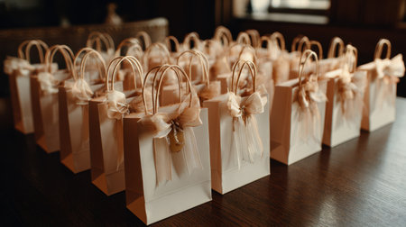 A collection of elegantly designed gift bags, each adorned with delicate ribbons, placed on a wooden table, creating a charming and inviting atmosphere for any celebration.