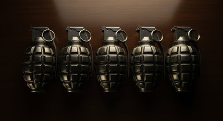 Five vintage military hand grenades made of dark, textured metal, neatly arranged in a row. symbolizes conflict, defense, and power.