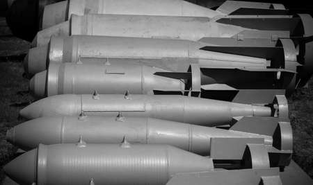 Rusty artillery shells in a row by bunker ready for use