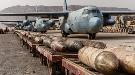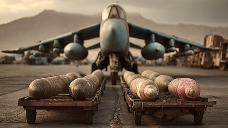 Several bombs resting on trailers, poised for loading onto military aircraft, emphasize the ongoing preparations for potential conflict and the readiness for action in a high stakes environment