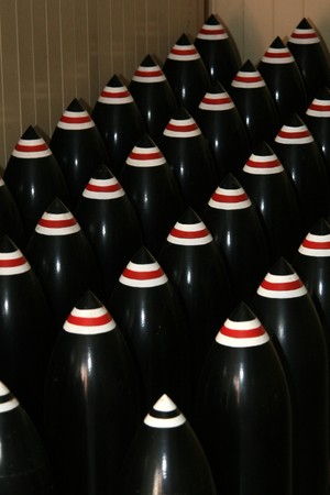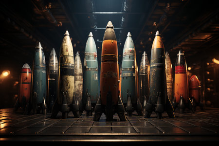 Concentric arrangement of stacked warheads creates a powerful abstract, perfect for conceptual illustrations about defense, aggression, or arms development. Great detail and dramatic perspective.