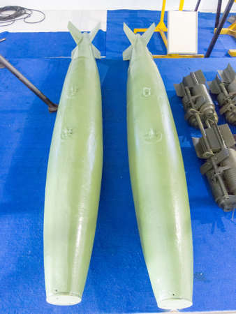 Bombs for an attack UAV. Air bombs for an attack unmanned aerial vehicle at the international exhibition ARMS AND SECURITY - 2021. Selective focus. Kiev. Ukraine - June 18, 2021.