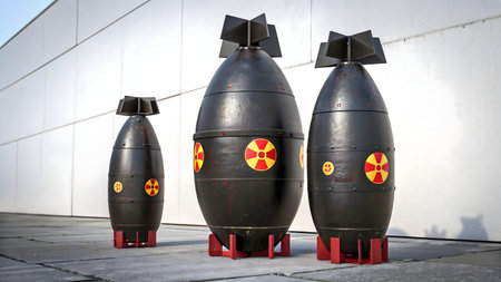Three stylized bomb sculptures with radiation symbols stand outside a modern building. This thought-provoking art installation creates a stark visual statement. Its design blends modern architecture with a powerful, symbolic message.