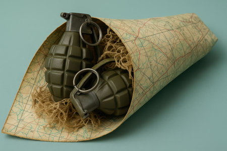 Two military hand grenades wrapped in a vintage topographic map, symbolic arrangement on textured surface.
