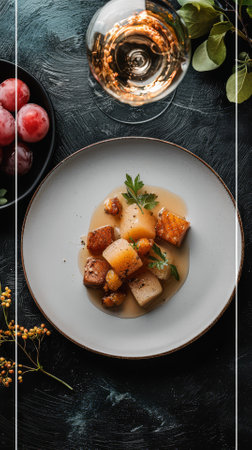A close-up view presents a beautifully plated gourmet meal, likely served at an outdoor event. The image showcases the dish's detail, with surrounding elements like flowers and people blurred in the background. Natural lighting and a rustic table enhance the scene, suitable for editorial or commercial applications.