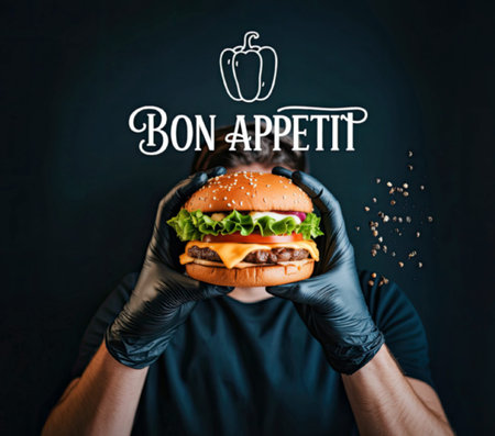 A person holding a delicious burger with fresh ingredients, wearing gloves, against a dark background with a pepper illustration.