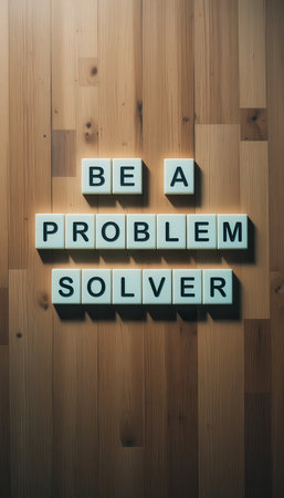 This image features an inspirational message on a wooden background, encouraging individuals to become problem solvers. Perfect for motivational projects or promotional materials.