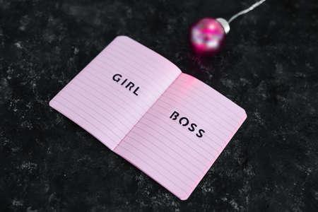equal opportunities Girl Boss text on top of pink notebook with bright pink light bulb symbol of ideas and inventiveness on black background