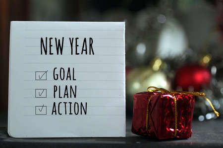 New Year business resolutions check list - Goal, plan, action. With red Christmas gift box on blur gray golden and red background of Christmas decorations.