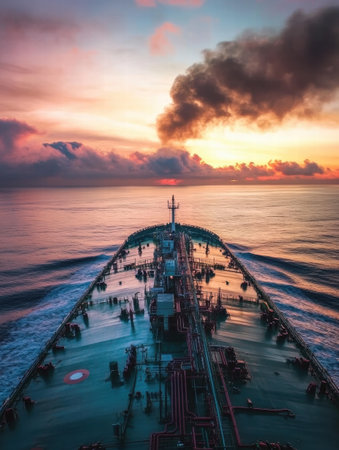 A large oil tanker navigates through serene ocean waters as smoke billows from its chimneys against a vibrant sunset backdrop.