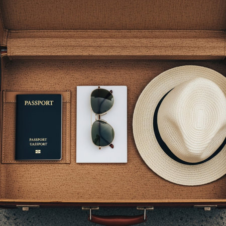 Essential summer planning: A passport, aviator sunglasses, and a straw hat packed neatly inside a vintage leather suitcase, ready for adventure.