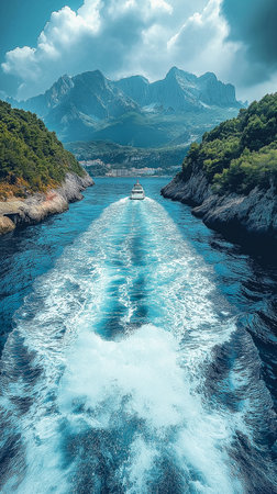A lone boat navigates through calm ocean waters under clear blue skies. The scene evokes feelings of serenity and adventure, perfect for travel and nature enthusiasts.