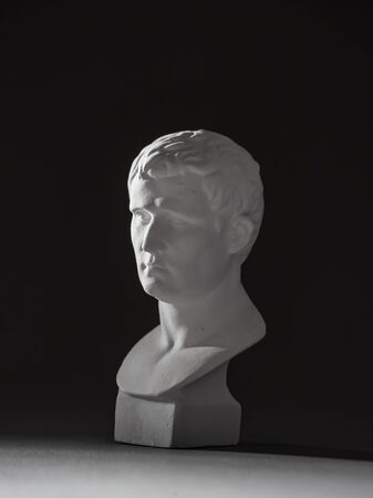 Bronze color gypsum copy of ancient statue of Germanicus Julius Caesar head for artists on black background. Renaissance epoch. Plaster sculpture of man face. Template for art design