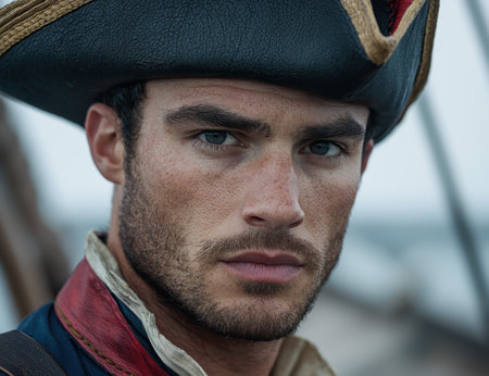 Pirate captain looking sternly, portraying a strong and determined leader from the golden age of piracy