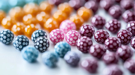 A vibrant assortment of round candies in various colors is spread across a white surface, adding a festive touch to the gathering. The candies feature playful polka dot patterns.