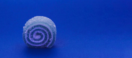 Round gummy on a blue paper background.