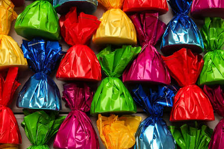 Candies in colorful wrappers as background, closeup