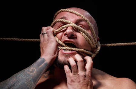 Image of binded man with rope on face