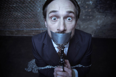 Businesspeople bound by red tape around their mouths standing in a row unable to speak or divulge information