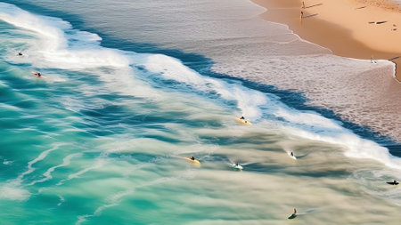 Generative AI : Aerial view of people with a surfboard along the coastline in Byron Bay New South Wales Australia