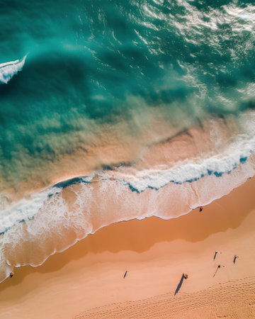 a person walks along the sandy beach, with the sparkling aquamarine water gently lapping at their feet. this captivating documentary-style photo showcases the stunning australian landscape from a birds-eye-view perspective. the light aquamarine and beige tones create a mesmerizing visual contrast, while the aerial view and vignetting add a touch of artistic flair to the image. ai generated