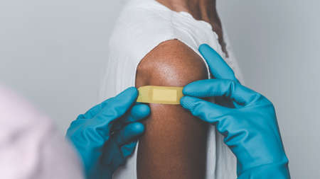 Senior woman after vaccination, close up hands with glove of doctor putting plaster on patient's shoulder.