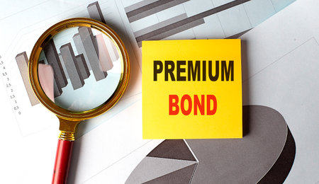 Yellow card with text premium bond placed on a financial charts beside magnifying glass.