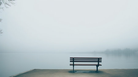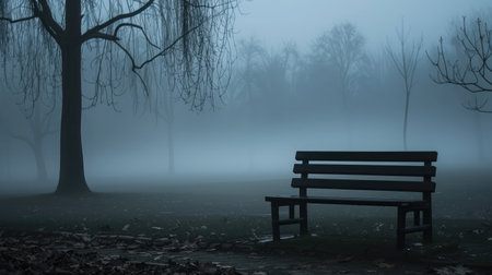 A lonely bench in a foggy park, evoking a sense of isolation and sadness