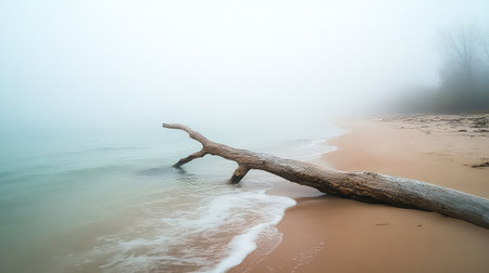 A serene beach scene featuring a fallen tree trunk on a sandy shore, enveloped by gentle fog and calm waters, creating a tranquil atmosphere.