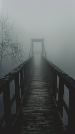 Misty wooden bridge leading into the unknown