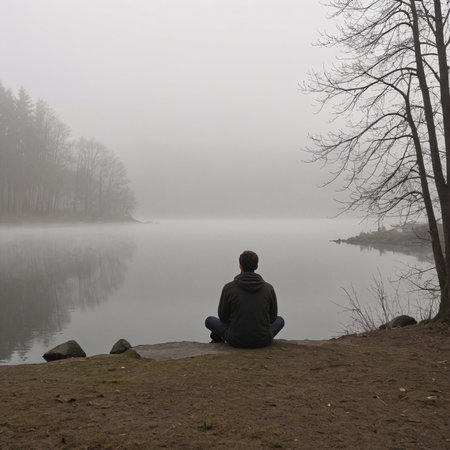 A contemplative figure sits silently by a fog-covered lake, with an ancient castle looming in the background. The scene evokes mystery and tranquility.