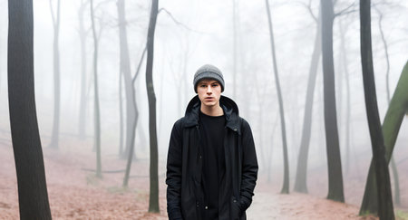 A young man in a black coat and a knitted hat stands in a foggy forest