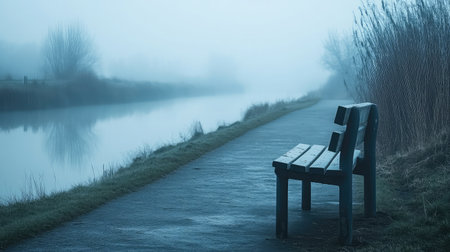 Old wooden bench overlooking a running path by a tranquil lake, surrounded by fog