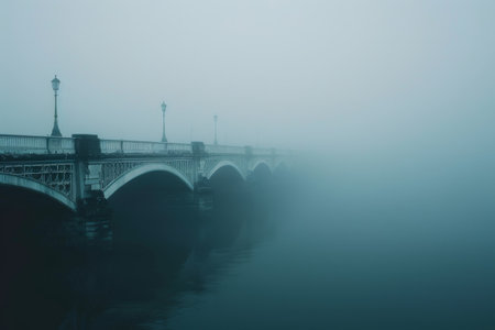 Fog engulfs a suspension bridge creating a mysterious atmosphere at dawn
