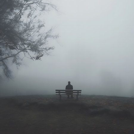 A lone figure sits on a bench shrouded in thick fog, creating an atmosphere of solitude and contemplation.