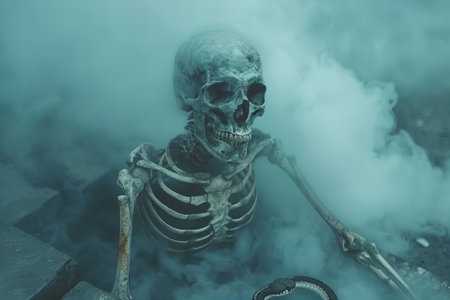 Illustration of skeleton sitting on the ground in the smoke, high quality, high resolution