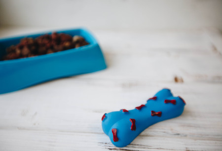 Chewing bone in blue bowl, black background