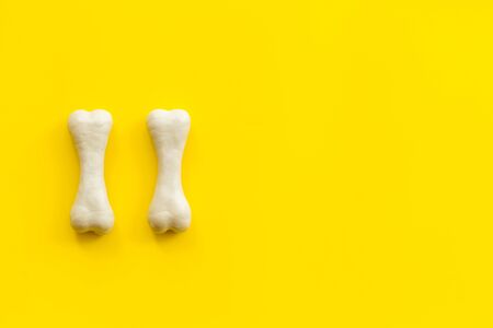 Treats for dogs. Chewing bones on yellow background top view copy space