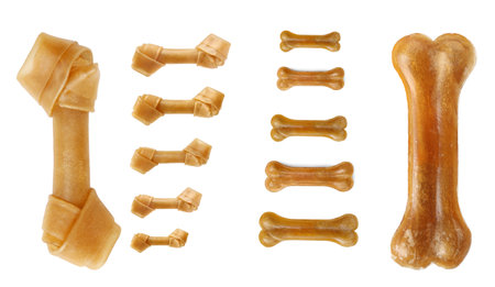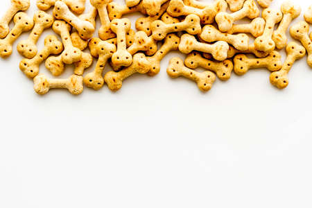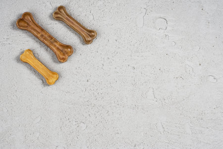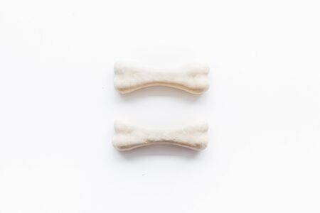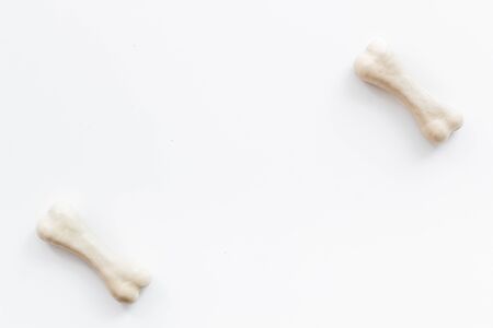 Treats for dogs. Chewing bones on white background top view copy space