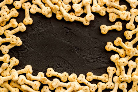 Dry pet food chewing bones on dark stone background top view copyspace