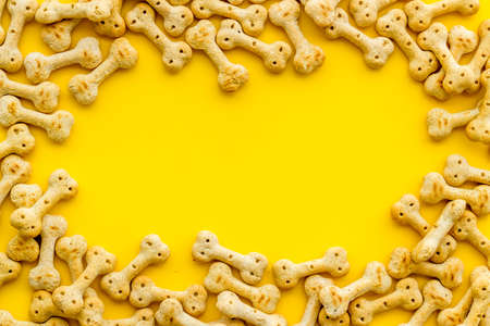 Delicious snacks for a dog on a bright one-color yellow background, top view. Pet care and veterinary concept. Spase for your text or image.