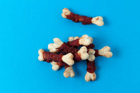 Chewy tasty treat in the form of bones for dogs on blue background