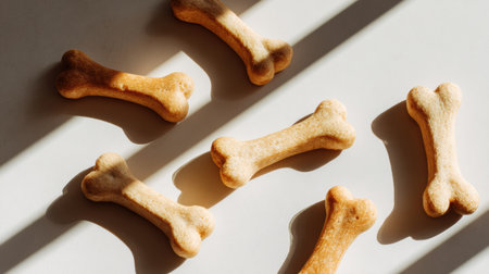Dog bone treats are beautifully laid out in natural sunlight, creating an inviting scene enhanced by diagonal shadows and a clear top section for focus.