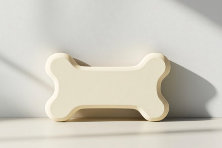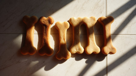Flat lay of dog bone treats basking in warm sunlight, showing their shapes and shadows on a neutral background, evoking a delightful pet-friendly vibe.
