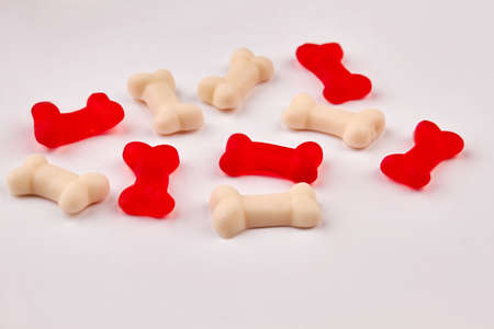 Colorful jelly bones on white background. Red and white gummy candies in shape of bones. Junk food concept.