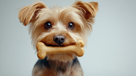 Adorable Yorkshire Terrier holding a bone in its mouth, radiating joy and playfulness in a studio setting with a light background. Perfect for pet lovers!