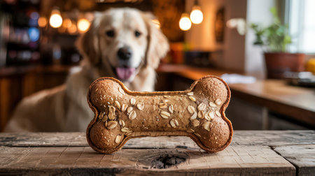 A delicious dog treat rests on a wooden counter while a joyful dog waits nearby, creating a warm atmosphere.