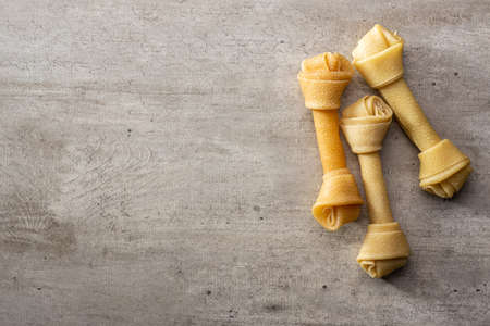 Delicacy for dogs. Chewing bone for dog on gray background. Top view.