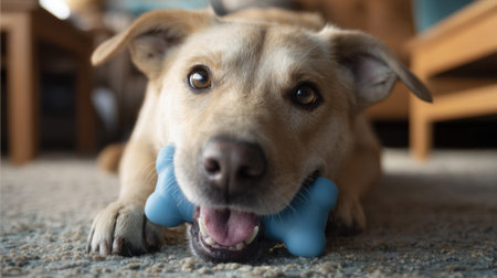 Medium shot of a dog happily chewing on a durable rubber toy made from ecofriendly nontoxic materials showcasing sustainable playtime essentials