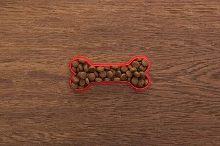 top view of dry pet food in bone on wooden table